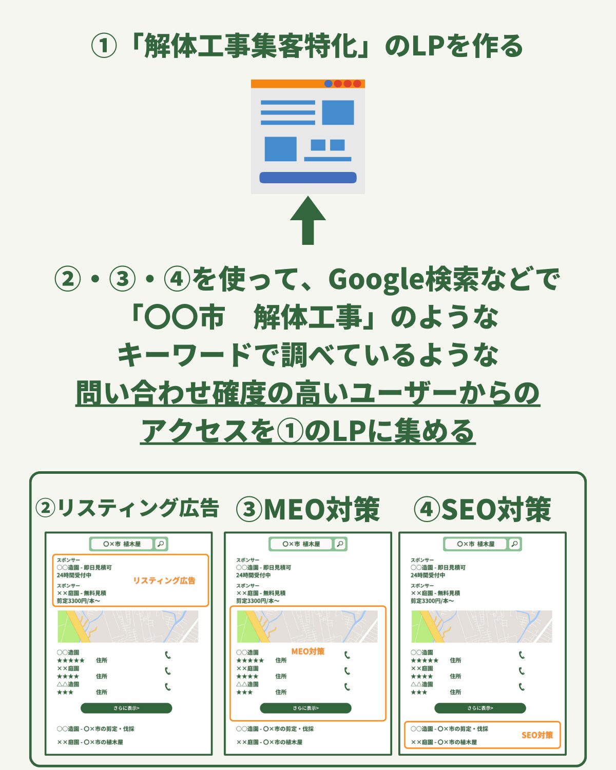 以上のように、解体工事の集客には、LPを作成し、そこにリスティング広告・MEO対策・SEO対策といったアクセス獲得戦略で、LPにアクセスを集める戦略をお勧めしております。